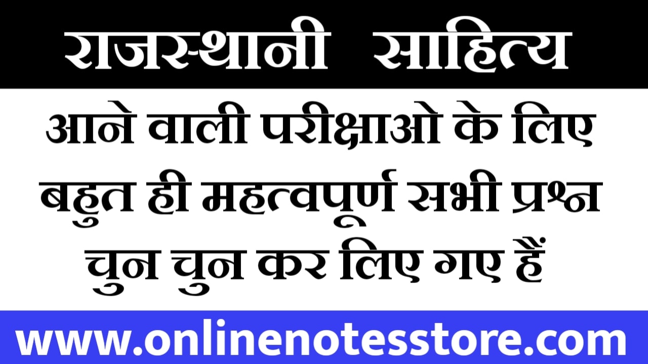 यहाँ से आप राजस्थानी साहित्य के सभी वस्तुनिष्ठ प्रश्न एक्साम पैटर्न के हिसाब से बनाने हुये है सभी प्रश्नोत्तरी चुन-चुन कर लिए गये हैं जो कि पिछले कई एग्जाम में पूछे जा चुके हैं और आने वाले एग्जामो के लिए बहुत महत्वपूर्ण है। यह सभी प्रश्न आपके लिये मददगार साबित होगे ! आप website पर रोजाना अपडेट देखते रहे और लाभान्वित होते रहे !